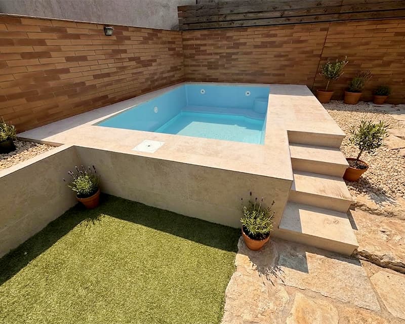 Mini piscina rectangular con escalones y banco interior, prepara para ser instalada en superficie.