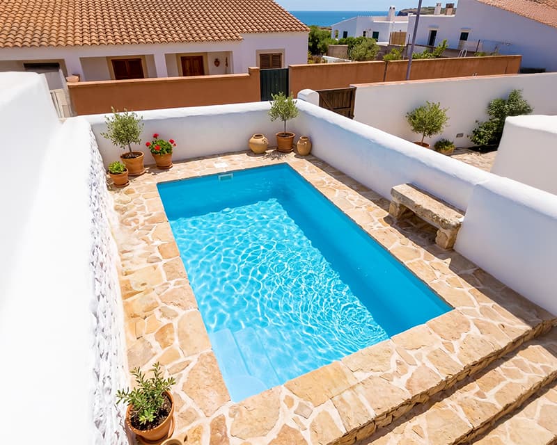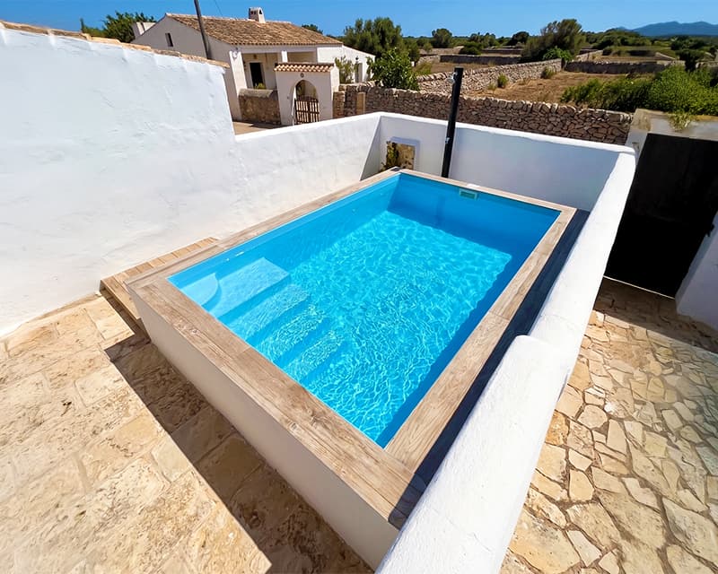 Piscina elevada de fibra de vidrio rectangular con escaleras laterales en el lado largo, a la derecha según se entra a la piscina. Esta piscina está reforzada para poder instalarse elevada.