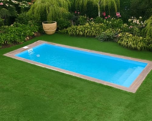 Piscina larga y estrecha con escaleras en lado corto para jardines estrechos