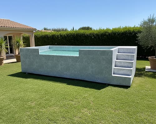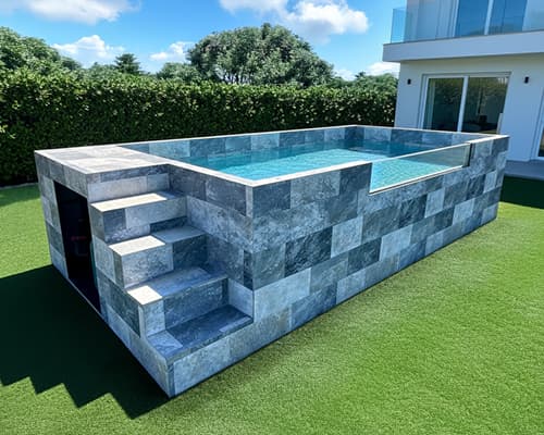 Piscina en altura tipo container prefabricada Jupiter59 con estructura de acero, recubrimiento de lámina armada diseño a elegir y cristal frontal para tener en casa una piscina de lujo.