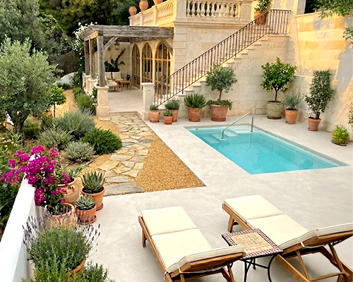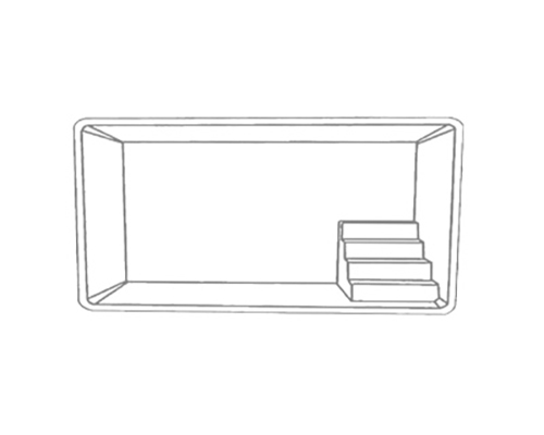 Piscina de fibra rectangular con escalera lateral pequeña, para aprovechar al máximo la zona de baño. Viene reforzada con estructura metálica para instalar como piscina elevada.