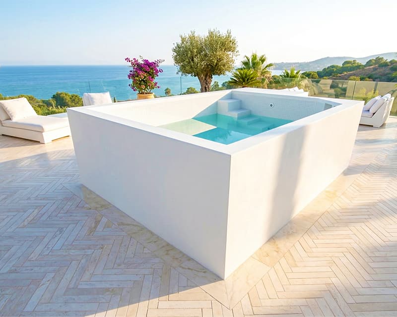 Esta piscina elevada autoportante tiene un acabado de revestimiento exterior acrílico color blanco por fuera y por dentro el acabado es de gresite con diferentes colores a elegir.