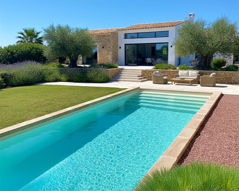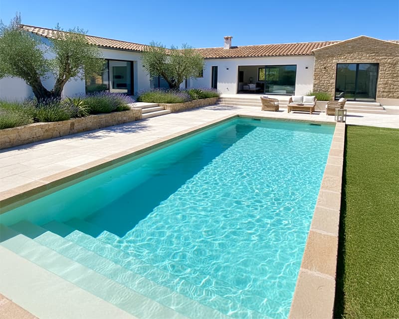 Piscina de fibra 8x4 enterrada Cadaqués85 rectangular moderna con escaleras amplias y cómodas para acceder a la piscina o para tomar el sol.