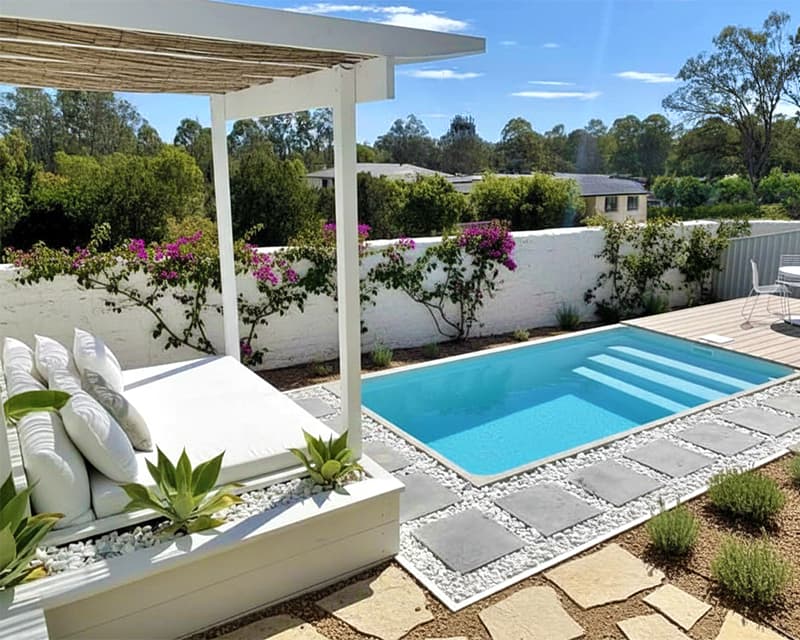 Esta piscina puede ser azul piscina, blanca, azul oscuro, arena, gris o verde turquesa.