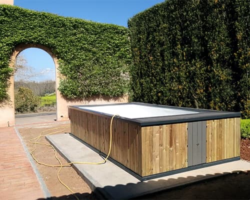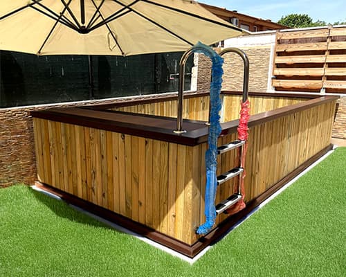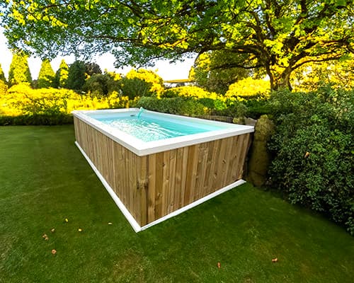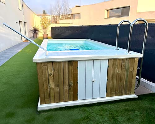 Piscina elevada autoportante con estructura y rematado final de aluminio, color a elegir, revestimiento perimetral de madera natural tratada con autoclave para su uso en exterior y revestimiento interior del vaso con lámina armada reforzada (1,8mm/2,2mm), color blanco interior . El cuarto de depuración tiene acceso por encima con unas tapas de madera sintética color a elegir: Gris IPE o NEVADO