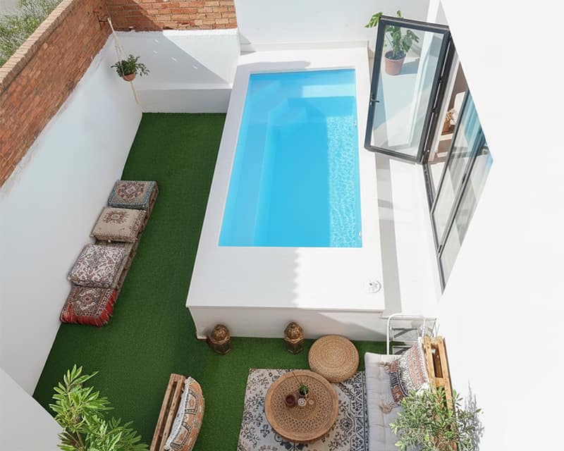 Piscina prefabricada poliester elevada con banco rectangular en la parte larga y en la parte corta en “L” que no necesita permiso de obra.