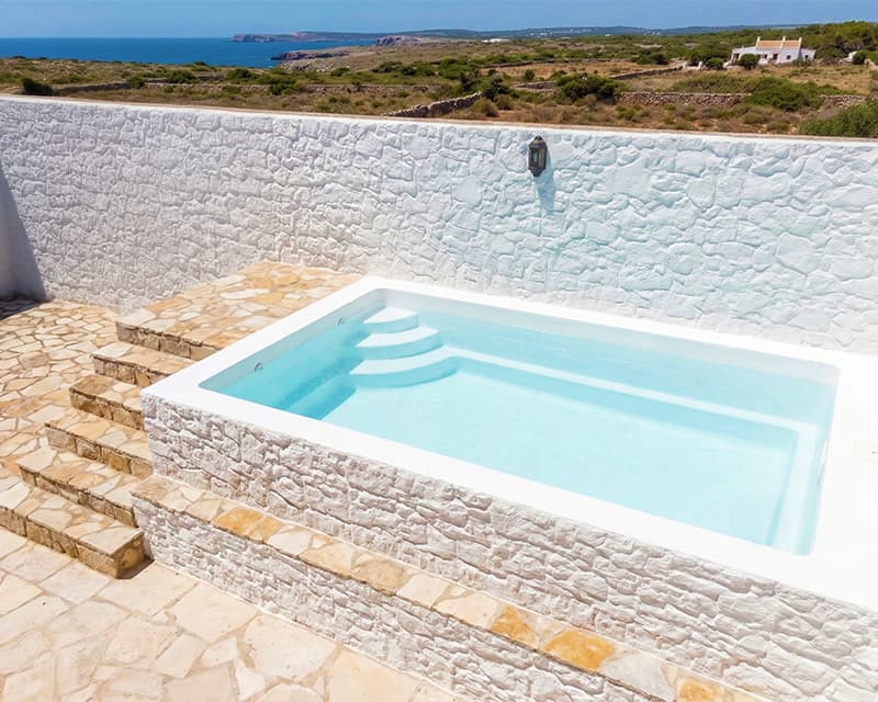 Piscina de fibra rectangular con escalera lateral pequeña en forma de tarta, para aprovechar al máximo la zona de baño.