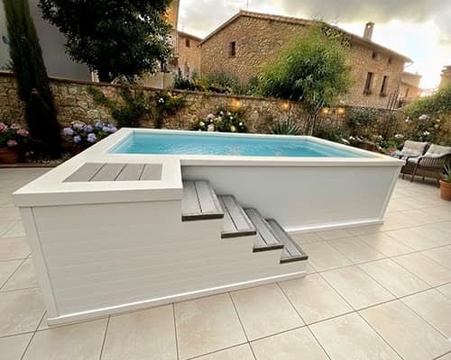 Piscina autoportante de aluminio lacado con estructura en aluminio y revestimiento interior de lámina armada blanca.