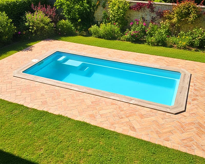 Piscina de poliéster rectangular tipo carril de nado con escaleras en la esquina inferior izquierda para entrar y salir de la piscina.