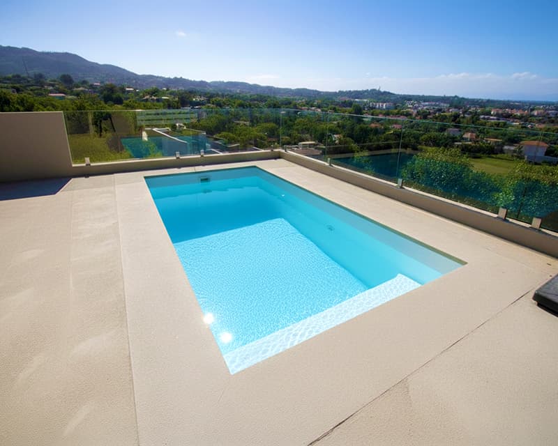 Esta pequeña piscina de fibra es una mini piscina elevada de un tamaño razonable para bañarse cómodamente en casa y con una altura correcta para sentarse en su banco de fibra colocado en el lado corto y tomar el sol refrescándose en la piscina sin pasar calor en verano.