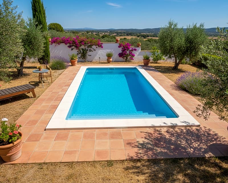 Piscina prefabricada poliester rectangular con escaleras de acceso rectas.