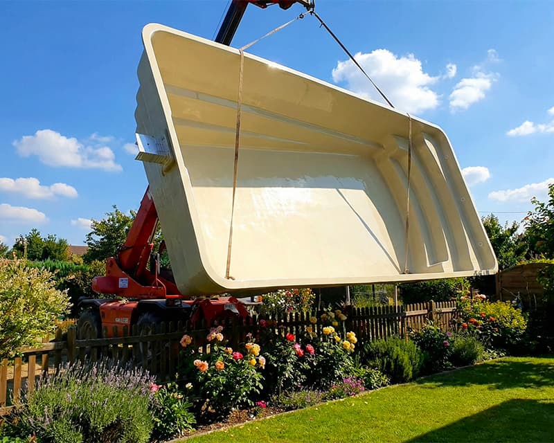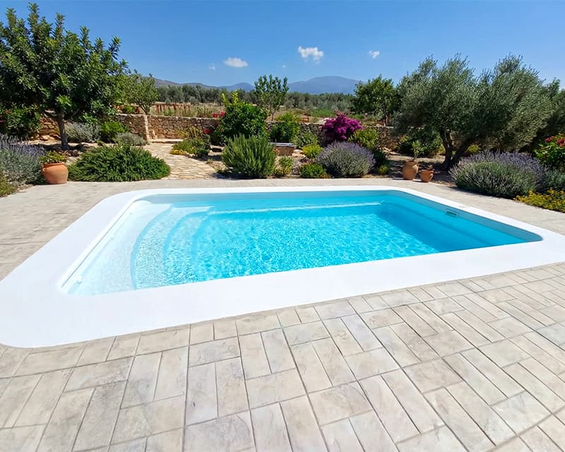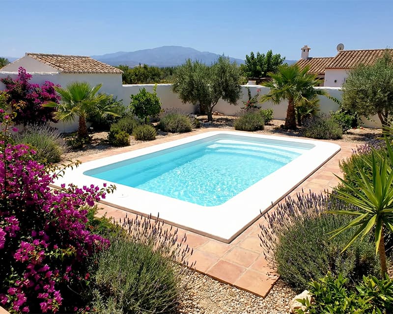 Piscina rectangular de poliester con escalera de 3 peldaños curvos para aprovechar mejor la zona de baño y fondo desnivel.