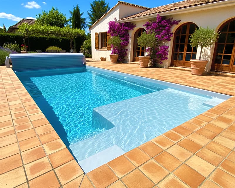 Piscina de fibra rectangular con playa para poder tomar el sol dentro de la piscina o bien como zona de chapoteo para niños pequeños como piscina infantil.