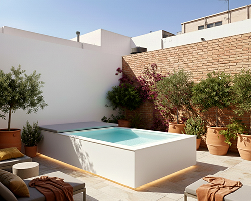 Piscina elegible en diferentes colores y dispone de diferentes módulos opcionales para completarla como cobertor, mesita, escalera exterior o tumbona lado largo o lado corto. También es posible equiparla opcionalmente con Clorador salino / bomba de calor / juego jets / bancos interiores